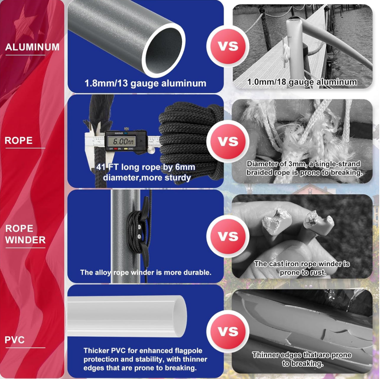 - 【What You Will Get】1 pair of white gloves, wearing them will make you more proud when raising the flag; 1 PVC sleeve with a length of 20 inch and an inner diameter of 2 inch; 1 American flag, Anti-UV! No fading!; 1* 41FT Durable Black Rope; 1* Pulley Truck made of high-quality aluminum alloy; 1 black ball ornament; 4 aluminum alloy flag clips.