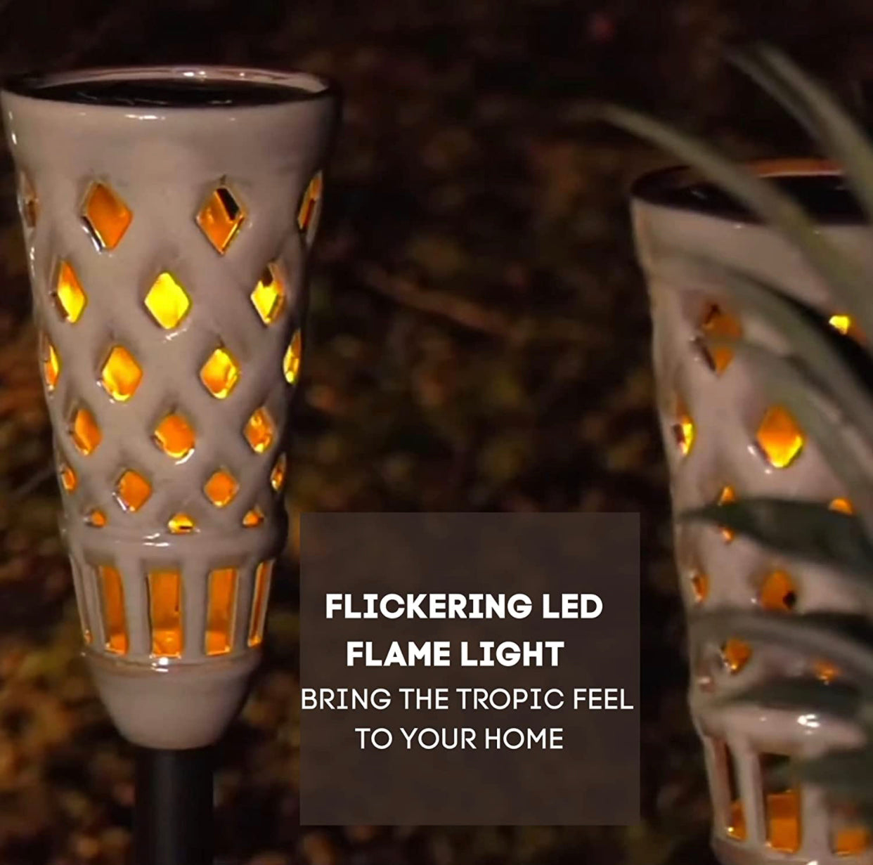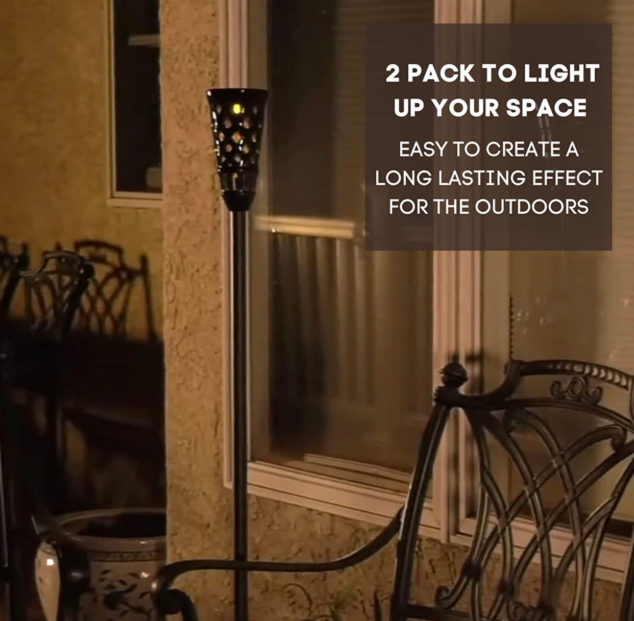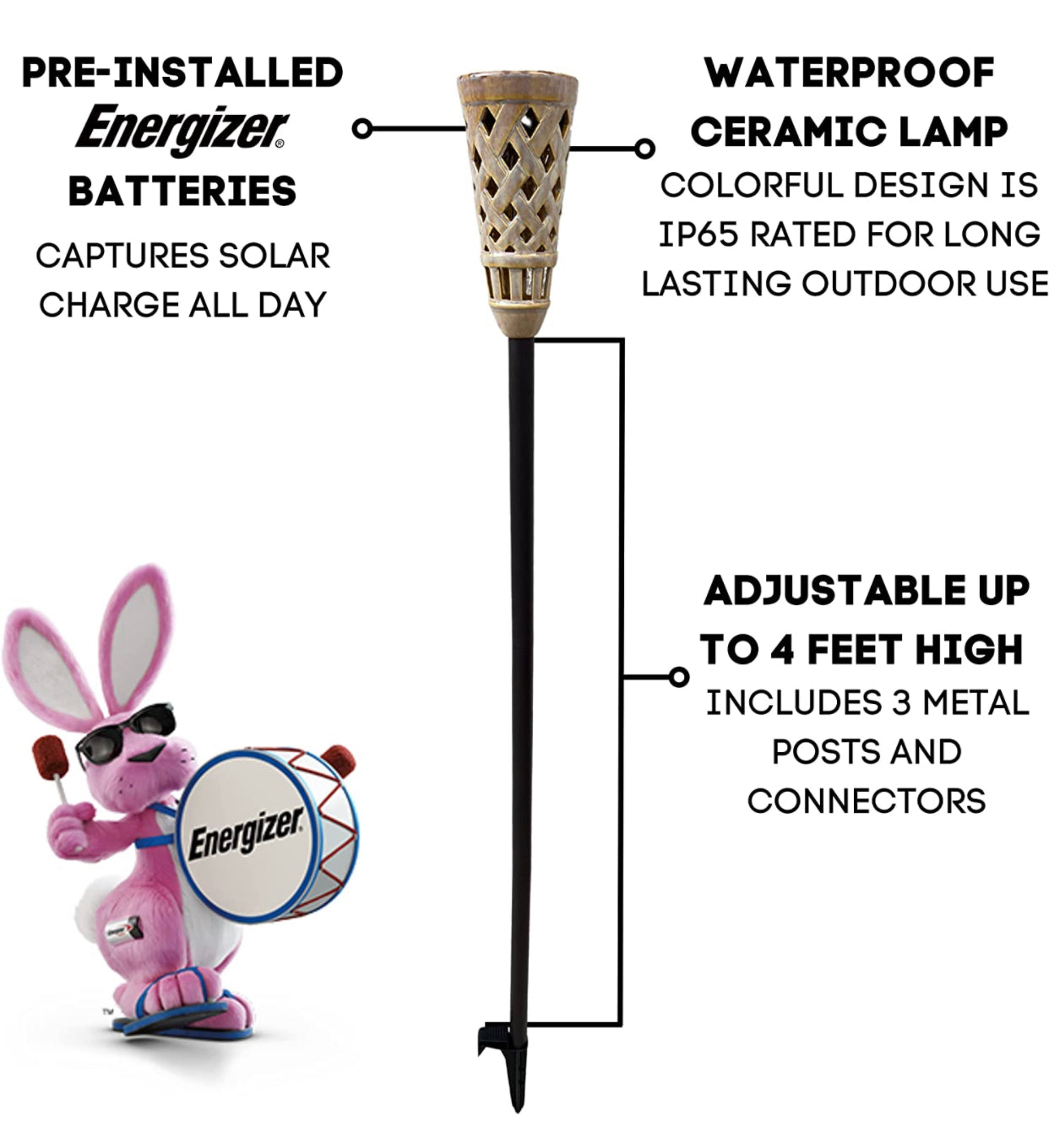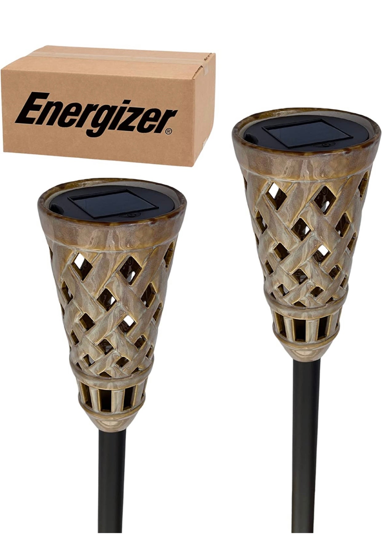 - Flickering Flames Torch Lights - Energizer solar outdoor lights cast a lovely warm glow like flickering flame, a safe alternative to the real “flames”. Solar torch lights are perfect outdoor decorations for patio, garden, porch, yard, pathway, making your yard stand out in the community.