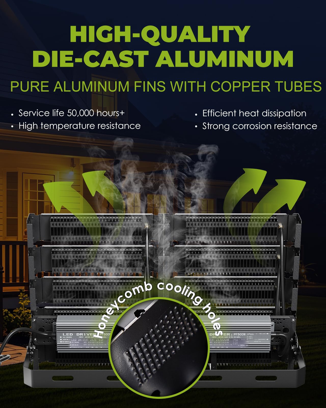 - Zero Maintenance for 15+ Years, Engineered to Outlast Others: This industrial-grade stadium light features a professional fin-style heat sink with exclusive patented honeycomb cooling vents, paired with 1070 pure aluminum housing + copper heat pipes for instant heat dissipation. The advanced thermal design keeps surface temps low, prevents corrosion, and extends lifespan to 50,000+ hours.