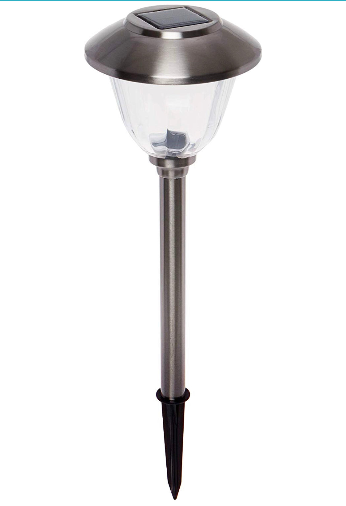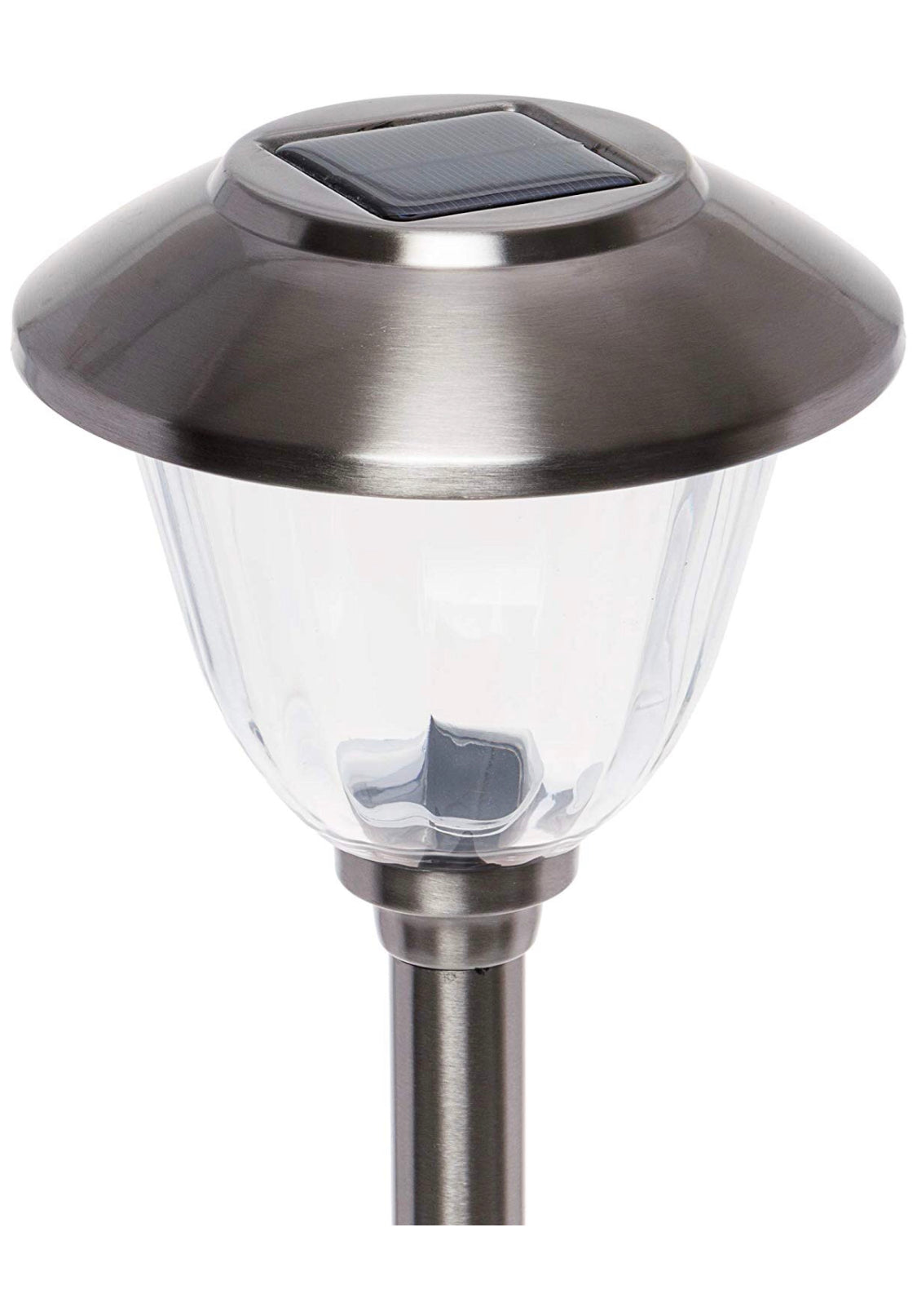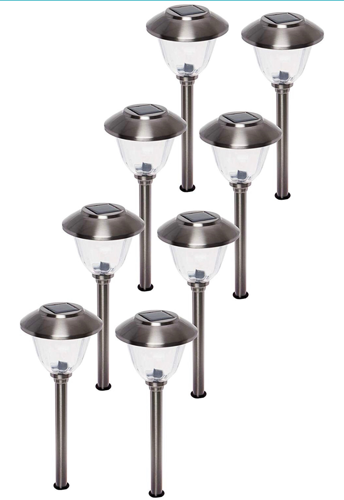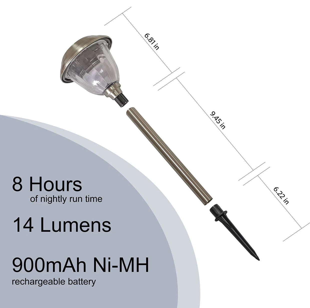 •8 pack includes: 8 stake lights, batteries, and ground stake, each with a pre-installed rechargeable Energizer AA NiMH battery•Glass lens with crystal panel•No wiring or electricity required•Stainless steel construction•Some SIMPLE assembly required•For outdoor use only•Waterproof•Measurements: