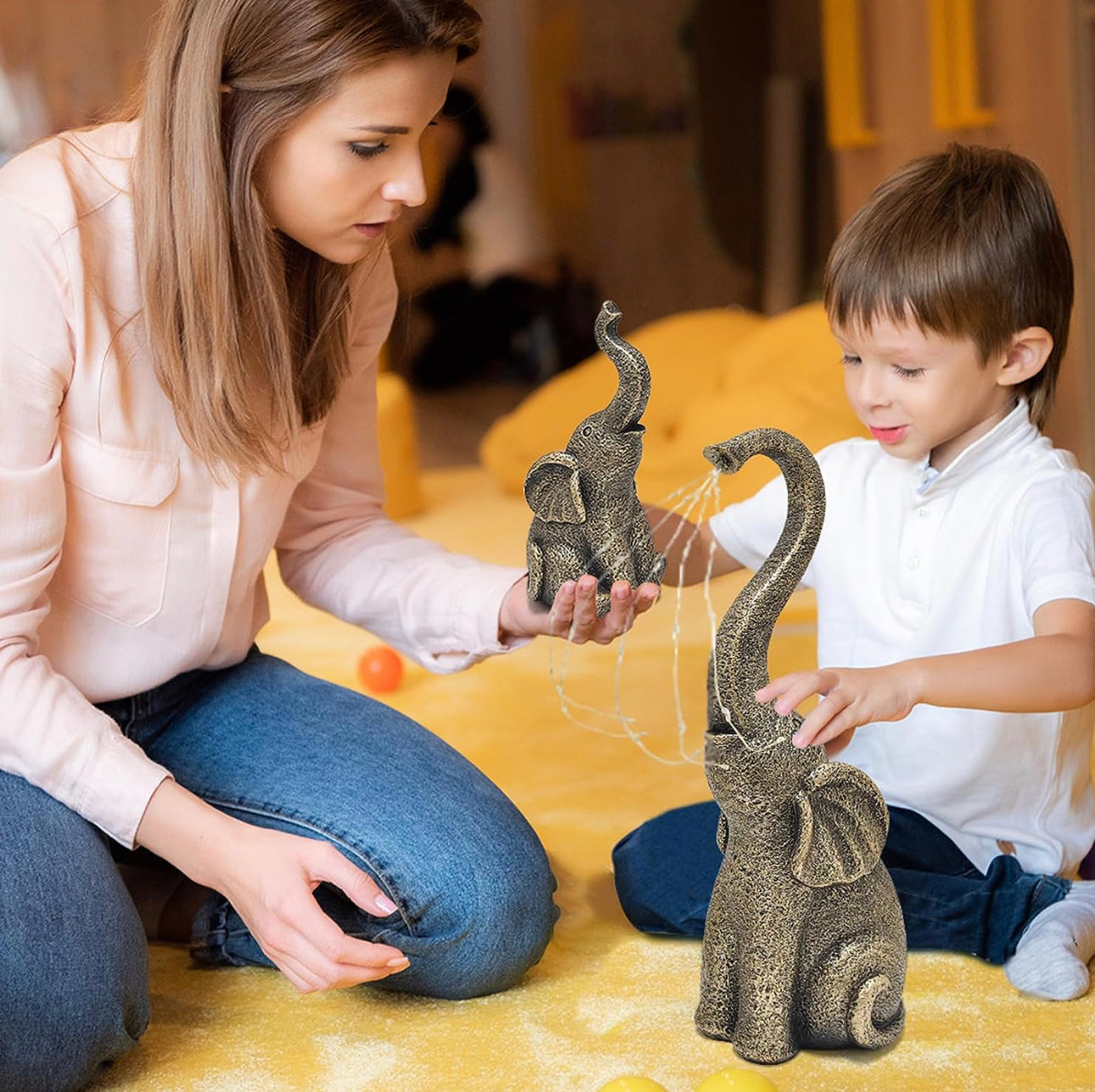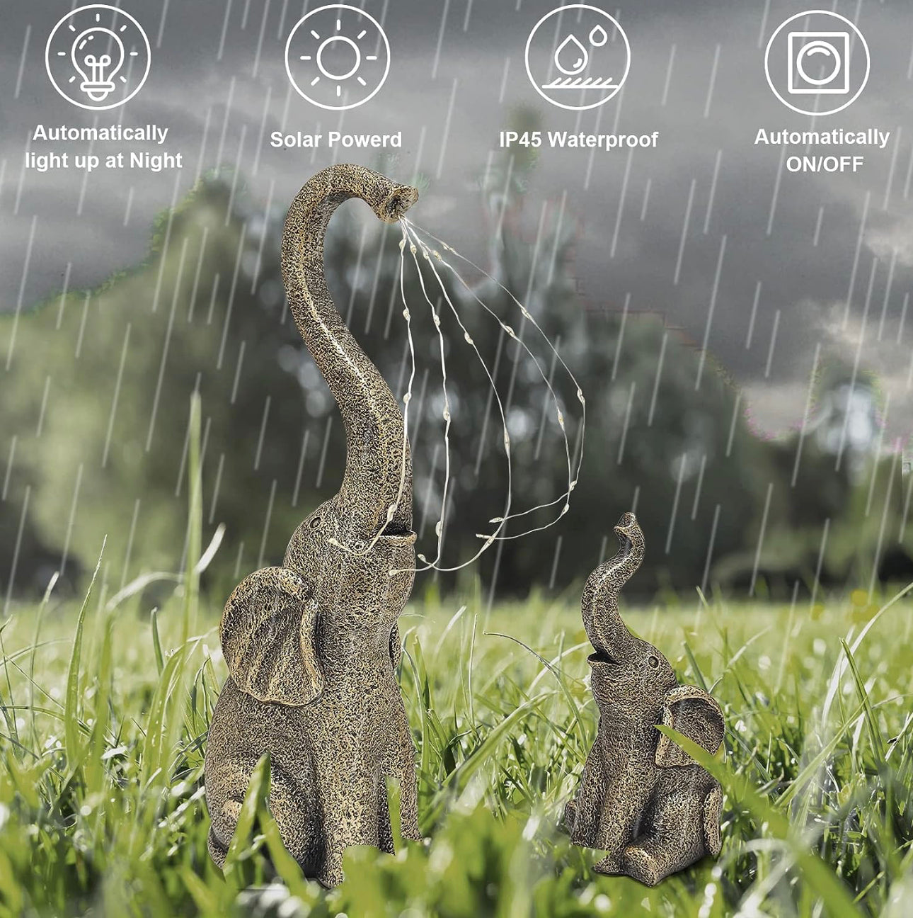 - Symbol of Good Luck: Bring good luck to your home with this charming 14-inch mother elephant and 6.6-inch baby elephant playing in the garden. Water sprays from the mother elephant's nose, blessing the baby elephant with love and prosperity. Elephants are a symbol of good luck in many cultures. With their happy faces and warm light, these elephants will make your yard cozier at night.