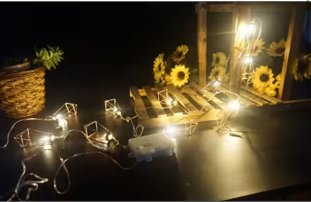 Metal crafted cage designs encase 10 LED lights to form a magical ambiance. For indoor use only suitable - if using outdoors place under a covered area. Requires 3 AA batteries (not included). If 1 bulb burns out the rest will stay lit. Cannot be connected to other lighted items. The silver wire is bendable and waterproof (battery pack is not waterproof). The lights have a convenient timer with 6 hours on 18 hours off. The lights can also be set as constant or flashing. Number of bulb on string: 10 lighted length: 5 ft. x 10.8 in. Total length: 12 ft. Spacing between each bulb: 7.8 in.