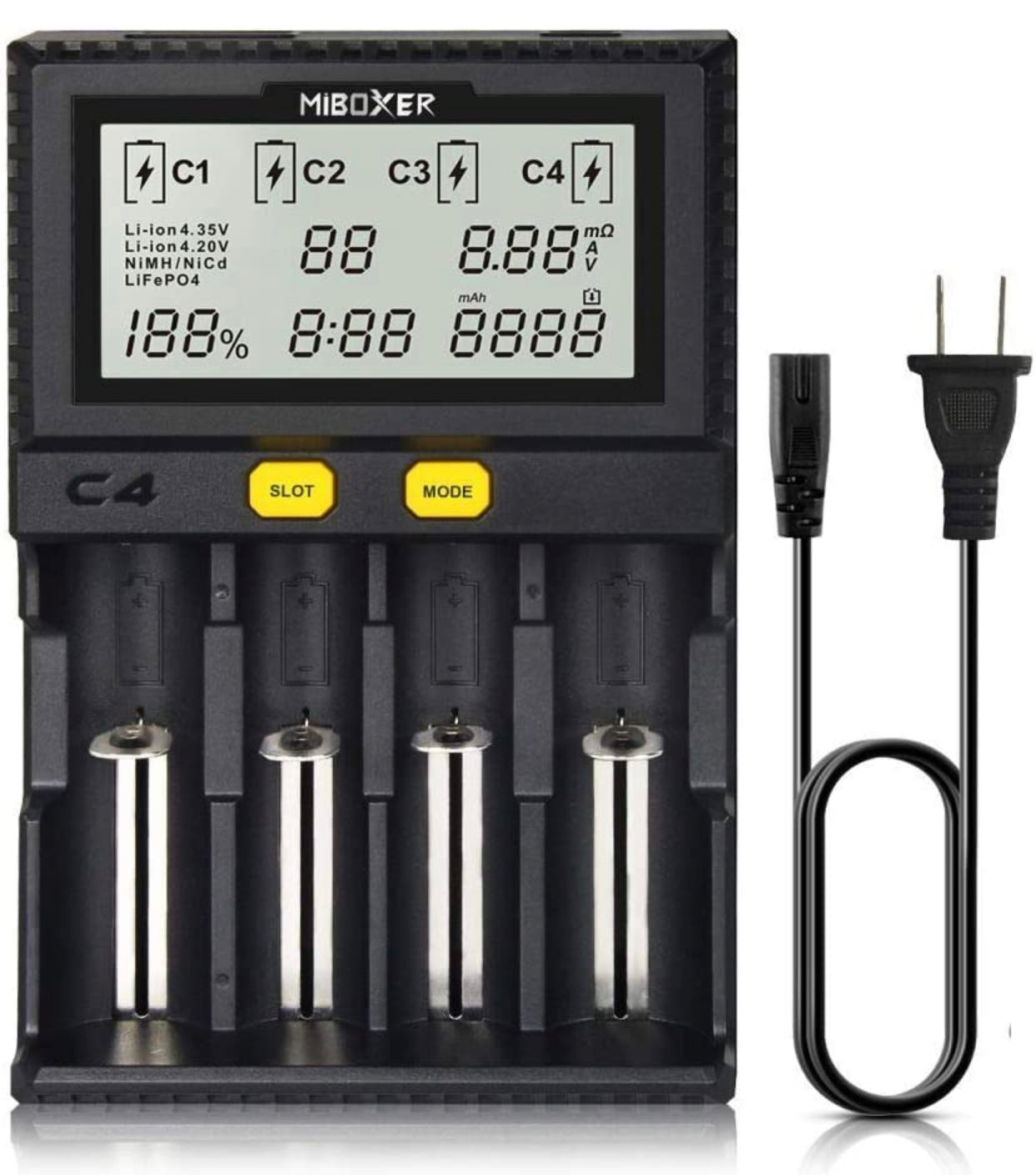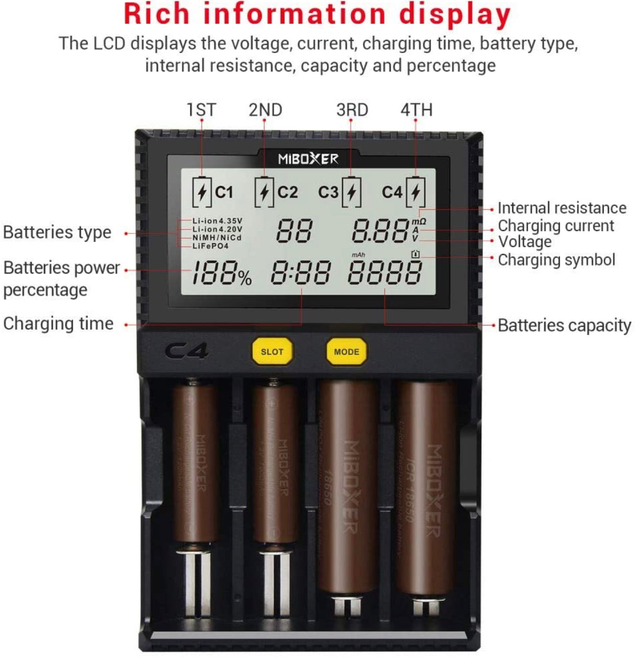 MiBOXER rechargeable battery charger with a large digital LCD screen display,states voltage,current,charging time,mode,battery type,internal resistance and battery capacity that has been charged and percentage, easily to understand the charging datum.The LCD back-light will become dark after 1 minute if there is no operation.