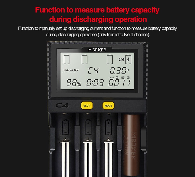 Its 4th bay also has discharge function, which can measure battery real capacity. Place battery into 4th bay, then long press ‘slot’ & ‘mode’ simultaneously until ‘0000’ flashes.