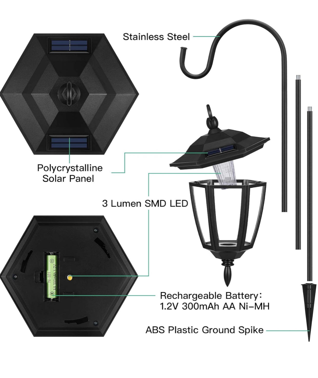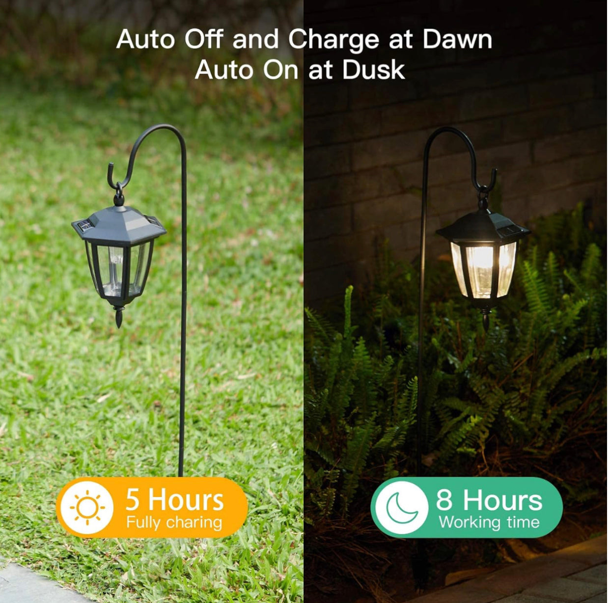 Powered by solar energy, solar panel absorbs direct and full sunlight during the day to charges the battery, the lights can last for 8 hours or more at night.