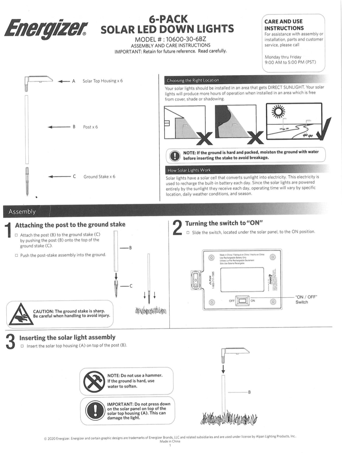 No wiring!!! Simply take out of the box, assemble, push the stake in the ground, give it a full charge, and then slide the switch to the desired light color. Perfect for a driveway, walkway, or sideways. These solar garden lights can be assembled in a few minutes.