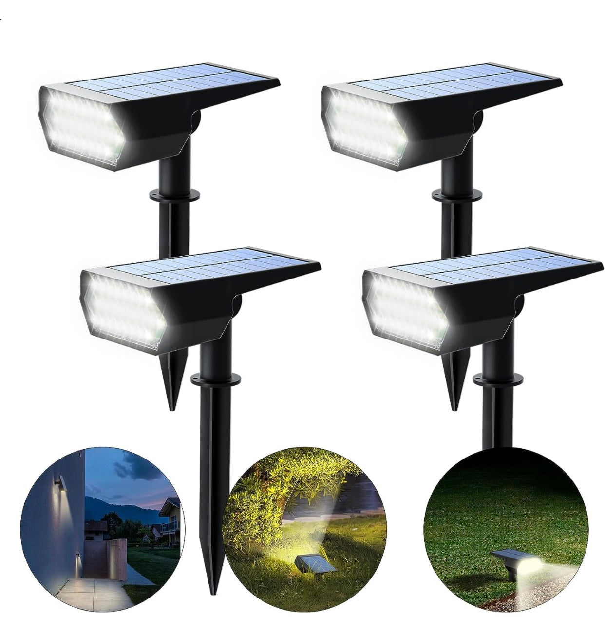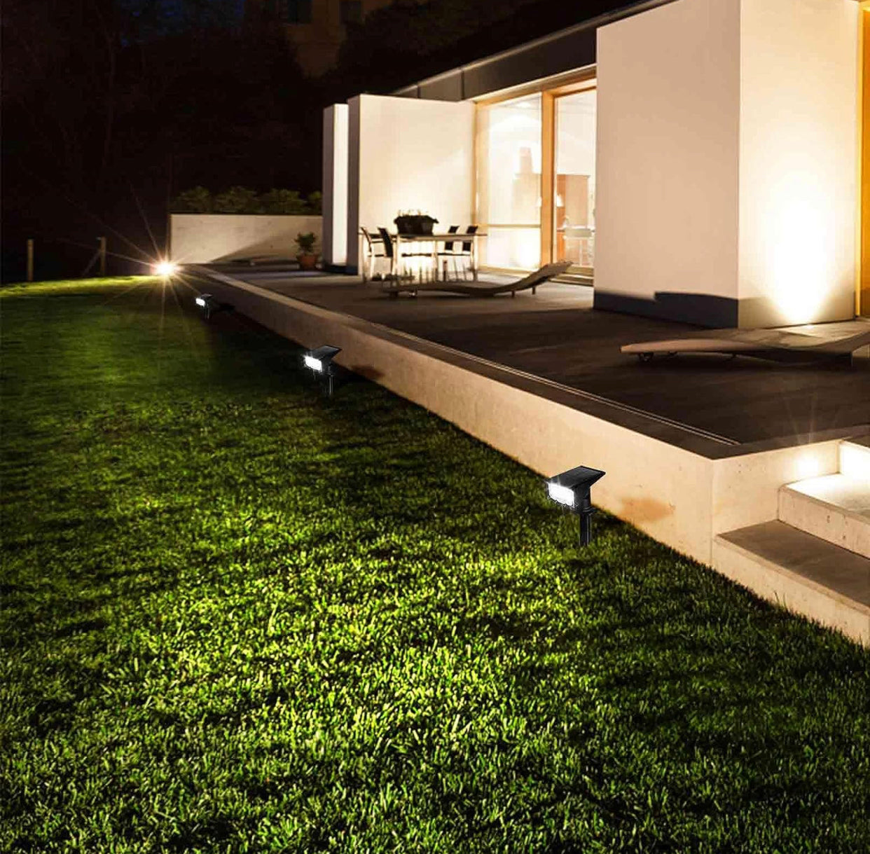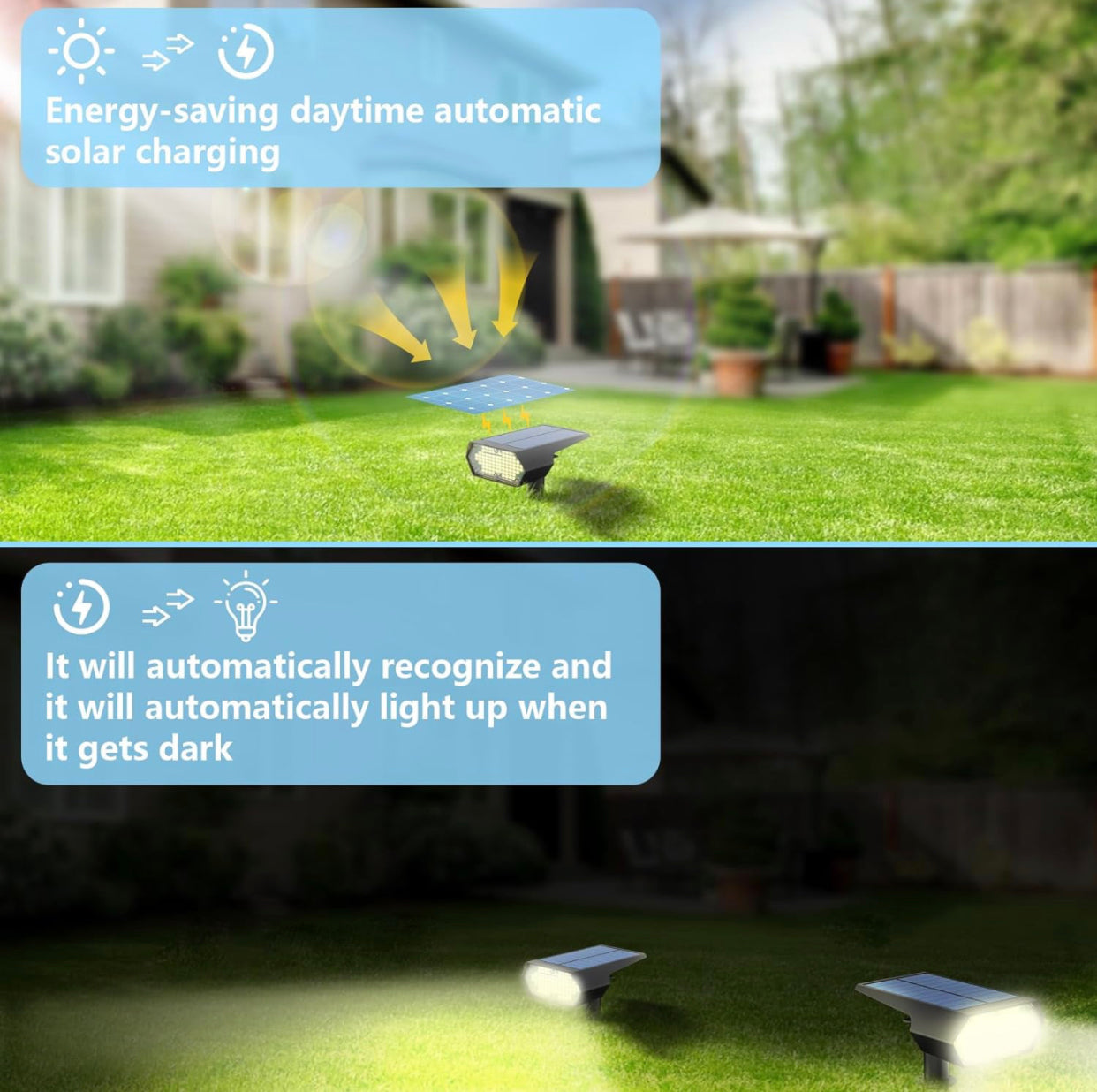 - Cool White Solar Spotlights Outdoor: A nightly light show! Automatically can come on when it gets dark. Really added life to Your trees and Lights up your landscaping nicely.Brighter 53 LEDs with 120Β° angle adjustable, bigger solar panel & longer working time with rechargeable battery. This solar landscape light is much more durable, Across to light up a larger area and perfect brightness, perfect color compared to other 4-12 LED lights in the market.