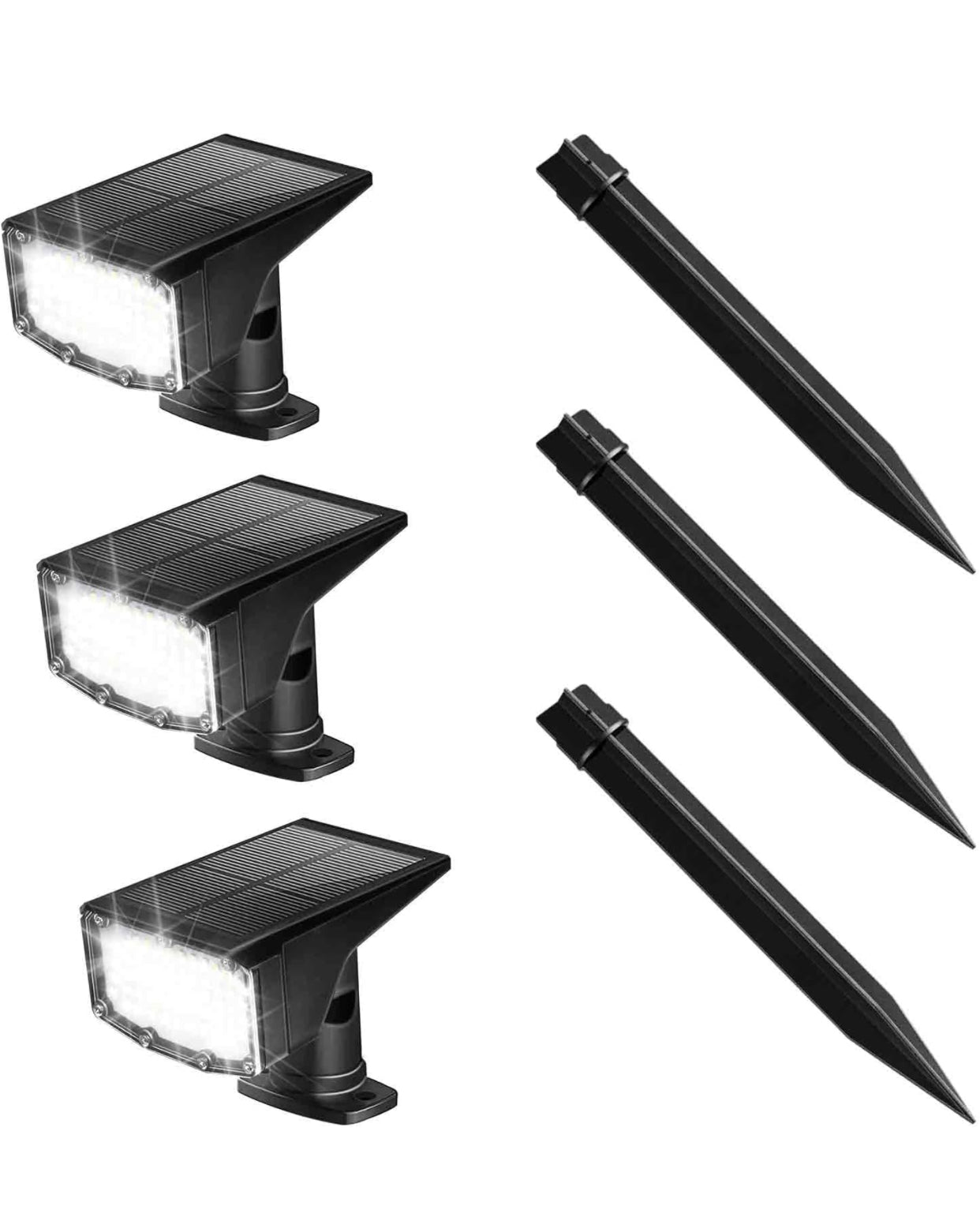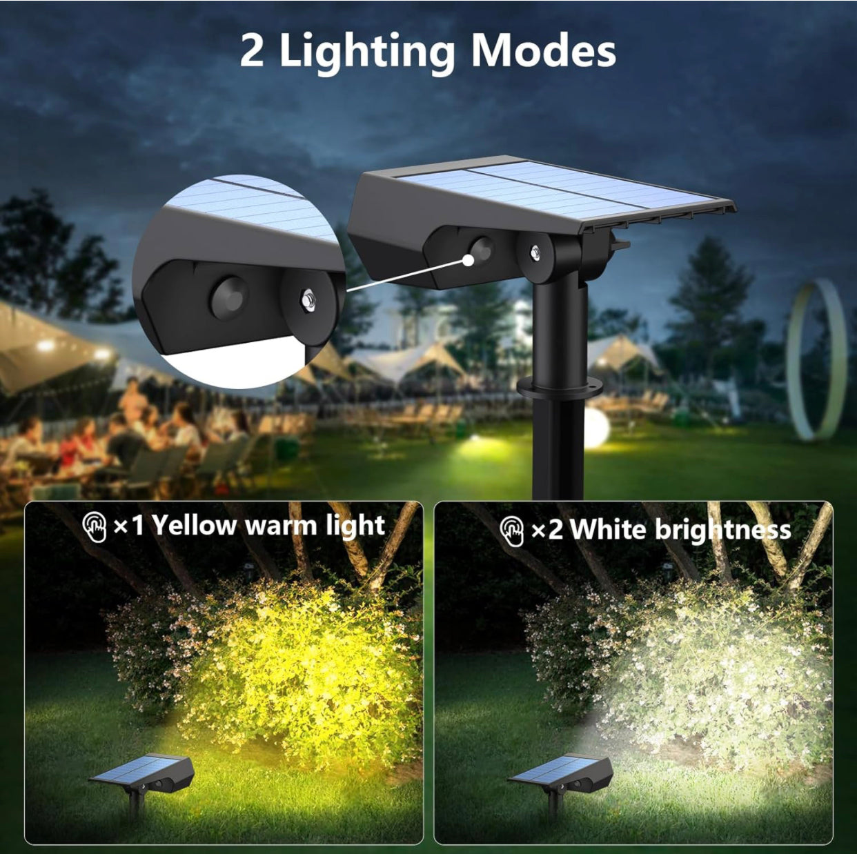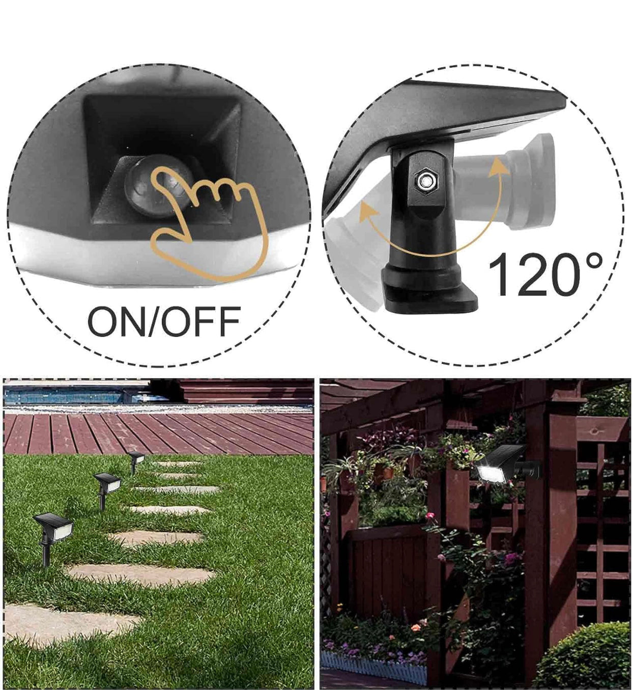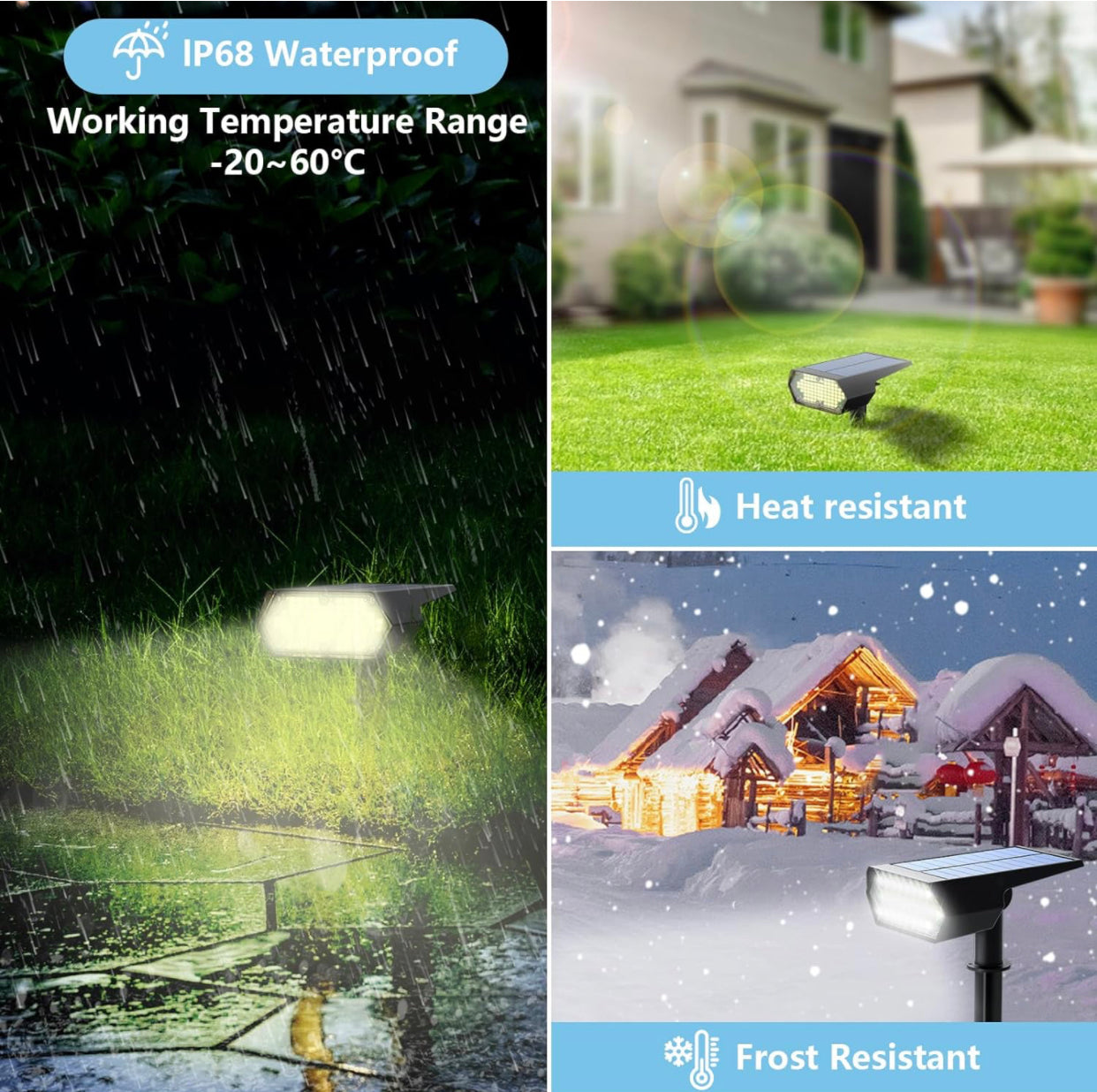 - Cool White Solar Spotlights Outdoor: A nightly light show! Automatically can come on when it gets dark. Really added life to Your trees and Lights up your landscaping nicely.Brighter 53 LEDs with 120Β° angle adjustable, bigger solar panel & longer working time with rechargeable battery. This solar landscape light is much more durable, Across to light up a larger area and perfect brightness, perfect color compared to other 4-12 LED lights in the market.