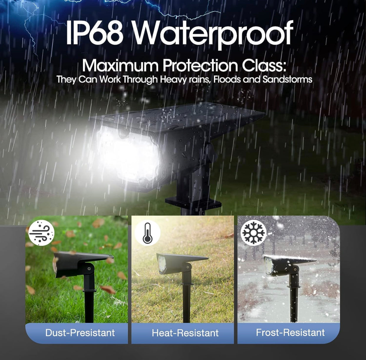 - Outdoor Lights are Waterproof, Frostproof, and Weatherproof: Using ABS high-strength material - Work Under -40β~85β. The IP65 waterproof rating allows the solar garden lights to withstand all kinds of bad weather such as rain, snow, wind frost, high temperature, etc. It is perfect for outdoor use! Anti-fogging design - can perfectly solve the problem of fogging on the lens, maintaining light intensity and prolonging the service life.