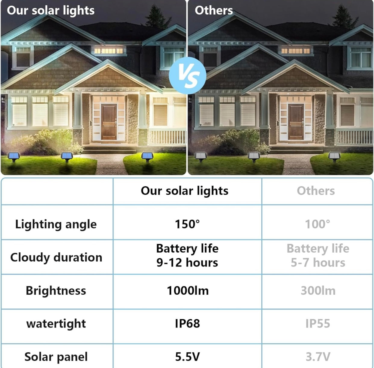 Because we have: 53 high quality LEDs, 1000 lumens brightness, 22% solar conversion rate, 2 brightness modes, IP68 waterproof rating, 120Β° illumination angle, longer working time, 40,000+ Lifespan, 2 installation methods