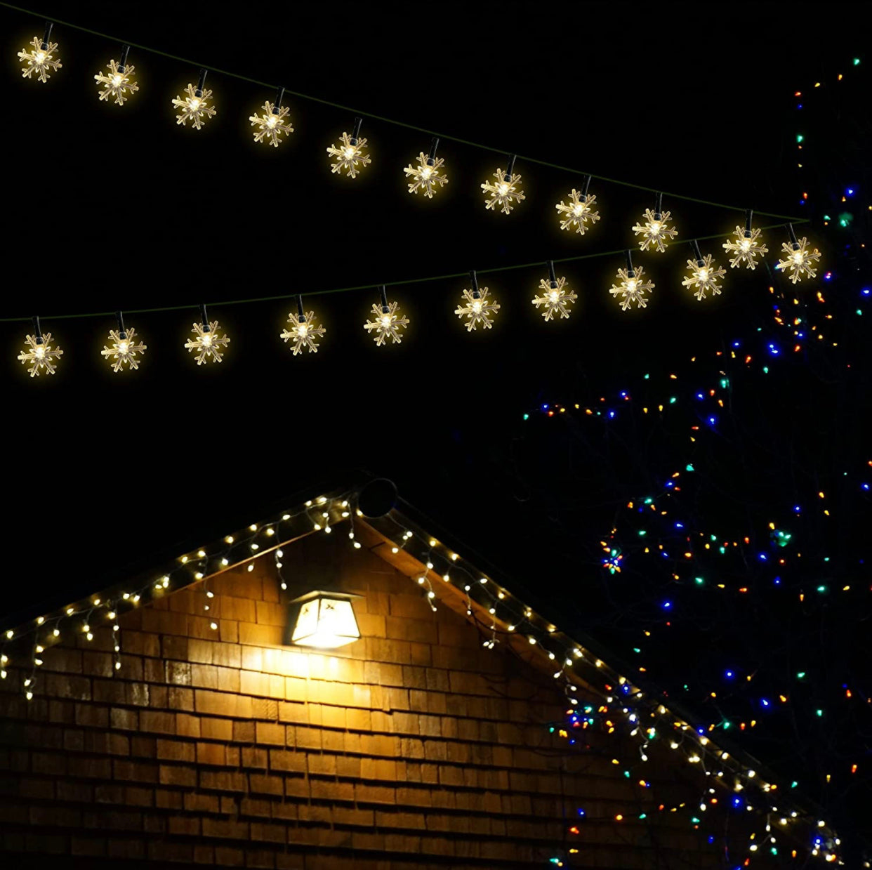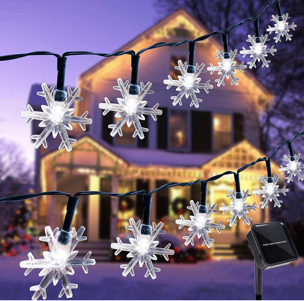 Our 100 super bright LED solar string lights with snowflakes glow in white are perfect for decorating and illuminating outside Christmas house ornament to create a warm ambiance.