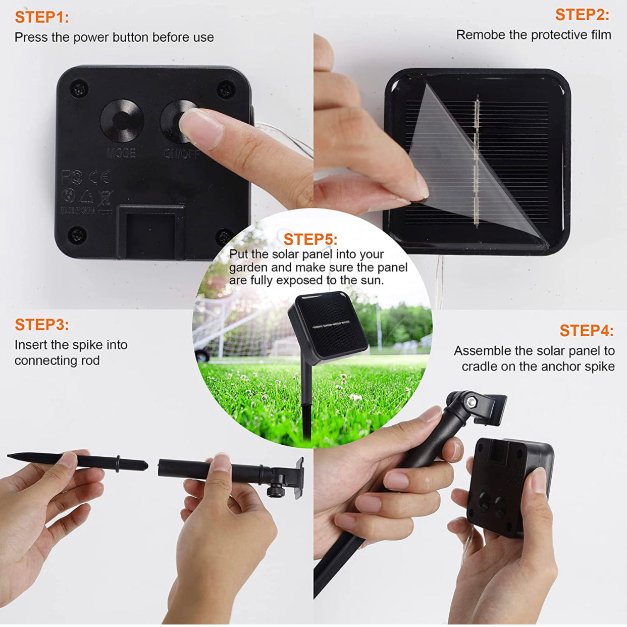 - Solar Powered Lights: Powered by solar, charged in full and direct sunlight for 8-12 hours and suffices for 10 to 14 hours (charging and working time will change depending on the weather), the lights automatically turn the light on at dusk and off at dawn. Each light includes NI-MH AA 800mAh rechargeable battery, the battery has sufficient capacity for bright all night. NOTE: There is a ON/OFF switch button at the back of solar panel, please switch it ON before charging.